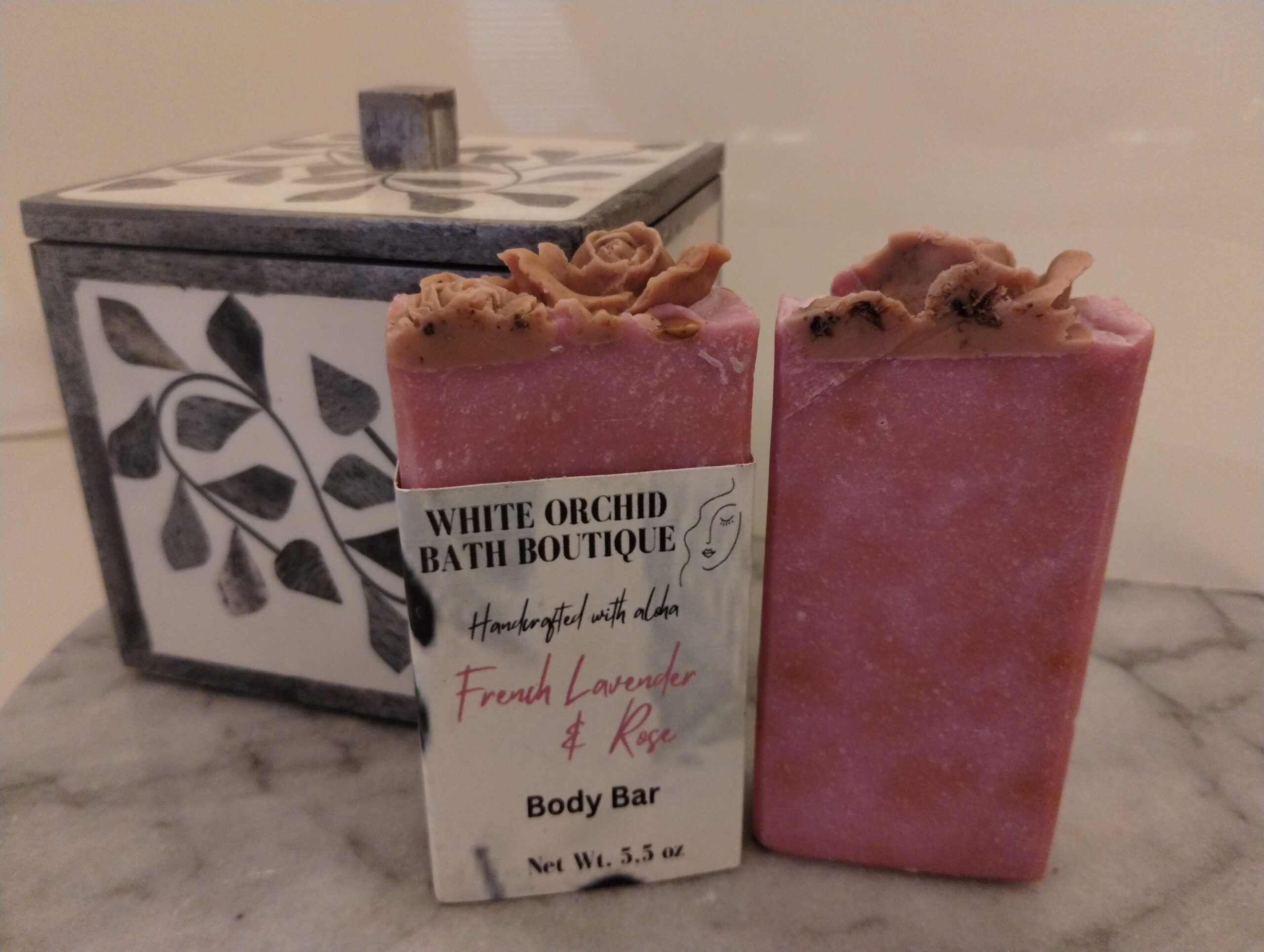 Ingredients: cocos nucifera (coconut) oil, distilled water, olea europaea (olive) oil, guineensis (palm) oil, glycine soja (soybean) oil, sodium hydroxide, vitellaria paradoxa (shea) butter, ricinus communis (castor) oil, sodium lactate, french lavender and rose fragrance oils, citric acid, mica