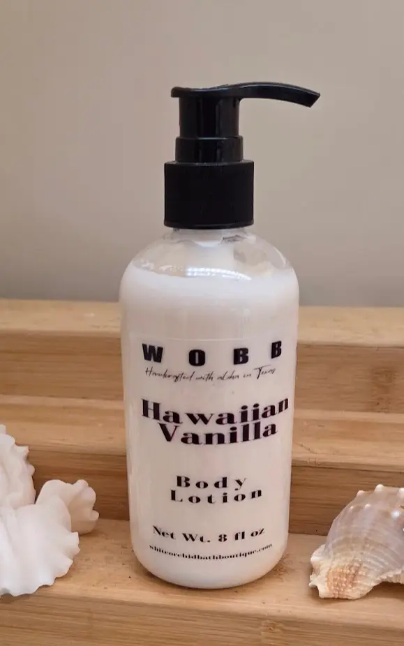 Ingredients: Ingredients: Distilled water, aloe barbadensis miller (aloe vera inner leaf juice), olea europaea (olive) oil, organic vegetable glycerin, prunus amygdalus dulcis (almond) oil, simmondsia chinensis (jojoba) oil, vitellaria paradoxa (shea) butter, theobroma cacao (cocoa) butter, glyceryl stearate, cetearyl alcohol, hawaiian vanilla fragrance, sodium stearoyl lactylate, cetyl alcohol, phenoxyethanol, caprylyl glycol, tocopherol (vitamin e)