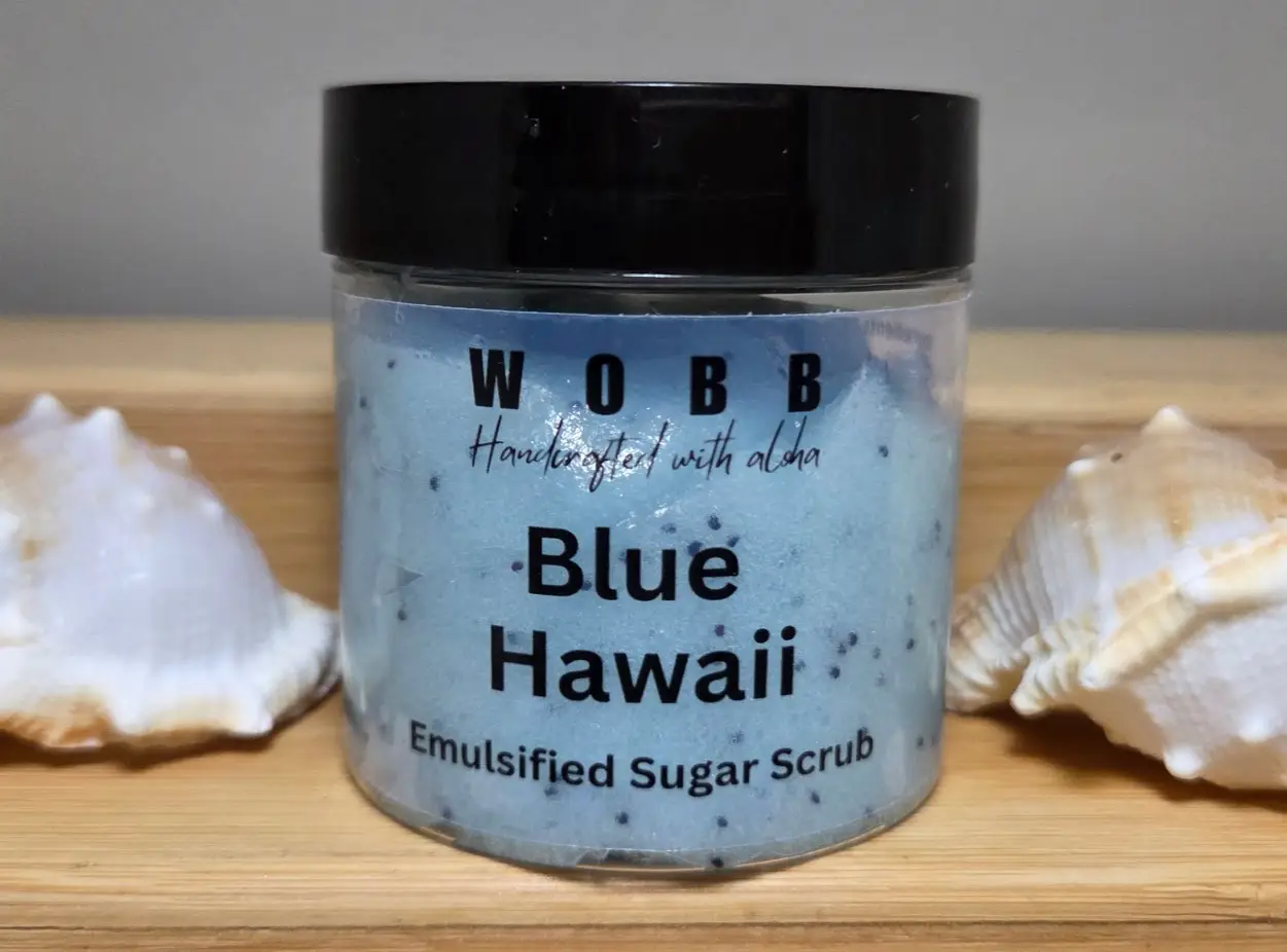 Ingredients: Cane sugar, distilled water, sodium cocoyl isethionate, cocoa-midopropyl betaine, organic vegetable glycerin, mangifera indica (mango) seed butter, prunus armeniaca (apricot) kernel oil, blue hawaii fragrance oil, glyceryl stearate, cetearyl alcohol, sodium stearoyl lactylate, diazolidinyl urea, idopropylene glycol, propylene glycol, somniferum (poppy) seed, mica