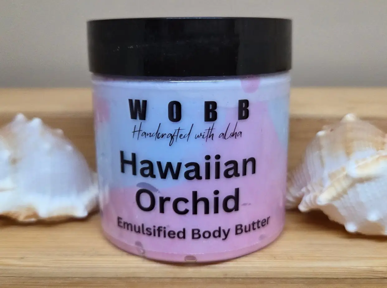 Ingredients: Distilled water, organic vegetable glycerin, cocos nucifera (coconut) oil, elaeis guineensis (palm) oil, macadamia ternifolia (macadamia nut) seed oil, aleurites moluccana (kukui nut) seed oil, emulsifying wax NF, vitellaria paradoxa (shea) butter, mangifera indica (mango) seed butter, theobroma cacao (cocoa) seed butter, cetyl alcohol, diazolidinyl urea, idopropylene glycol, propylene glycol, sea salt & orchid fragrance oil